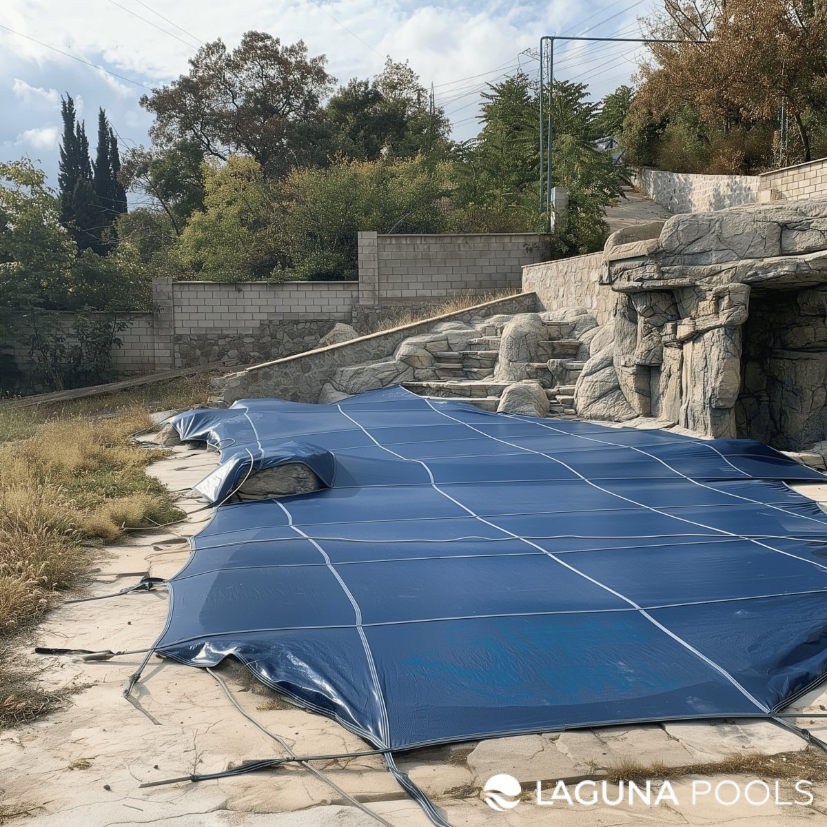Бассейн накрыт синим защитным тентом на бетонной площадке с каменными конструкциями и зеленью вокруг.